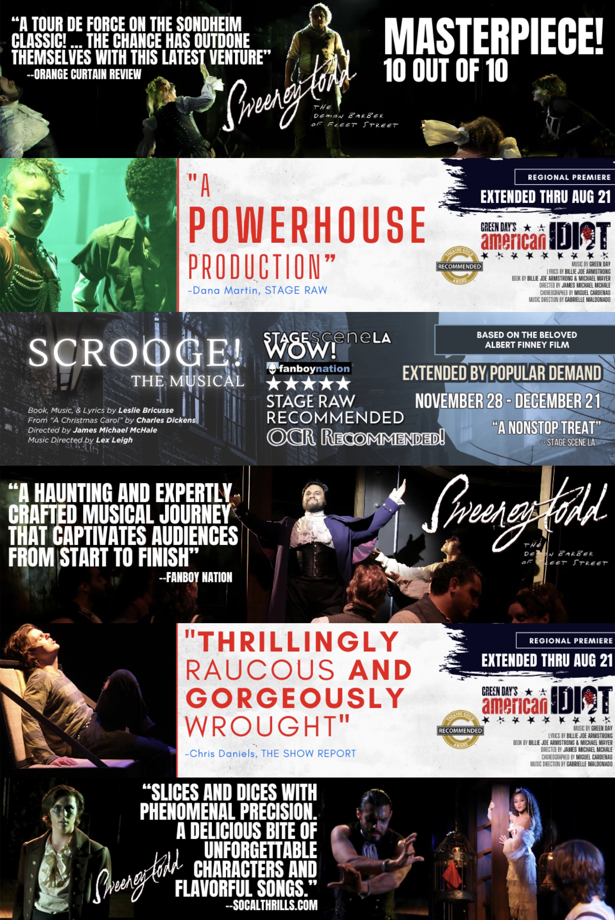 Recent directing credits include ONCE running at Chance Theater in Anaheim through March 1st. Other Chance Theater directing credits include Scrooge! The Musical, Sweeney Todd: The Demon Barber of Fleet Street (10 OCTG Award Nominations, Winner of the 2025 Orange Curtain Review Award for Best Musical), the OC Premiere of American Idiot (Winner of 6 Orange County Theater Guild Awards including Outstanding Direction of a Musical), the OC Premiere of the Pasek & Paul musical Edges, A Charlie Brown Christmas (re-mounted for two additional seasons due to the success of the original run), A Wrinkle In Time, Fancy Nancy Splendiferous Christmas (also receiving multiple remounts), A Wrinkle In Time, and The Eight Reindeer Monologues. He has been commissioned to write and direct a number of storytelling concerts for Pacific Symphony’s Family and Education Series, these include Beethoven: Trials to Triumph, A Dream of Tchaikovsky, Intergalactic Adventures, Music from the Movies and More, and The Curious Case of the Vanishing Violin, all presented at Segerstrom Concert Hall. Other directing credits include the World Premiere of Comedy of ERROR at American Coast Theater Company and Two Rooms at California State University Long Beach.